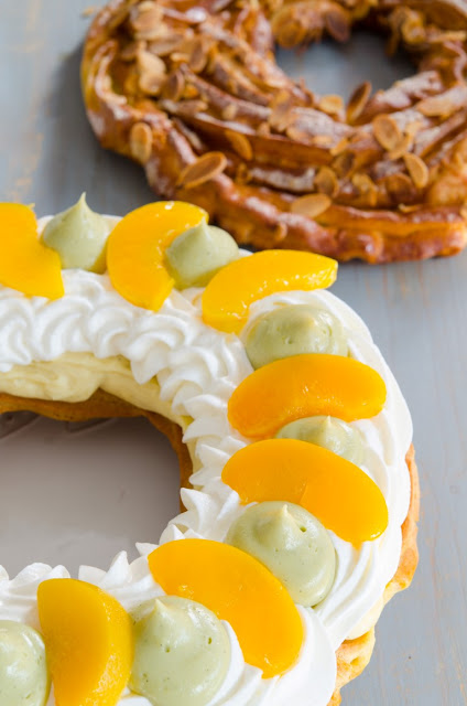 Montati Paris Brest: taiati fiecare disc de aluat pe orizontal in doua. Puneti crema de fistic intr-o punga de patiserie in care ati introdus un dui cu varful rotund. Repetati operatiunea si pentru crema de vanilie.