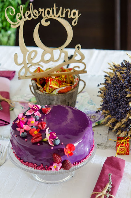 Si cum a fost un moment aniversar, am decis sa fac si un tort special cu aceasta ocazie. Bineinteles ca toate torturile de zilele noastre sunt speciale, insa de data aceasta am ales o tema speciala. In ziua aniversarii, ne-am imbracat frumos, mi-am ales un buchet cu spice si lavanda, ne-am luat de manuta si impreuna cu nasii si parintii nostri am mers la biserica sa ii multumim lui Dumnezeu ca ne-a adus pe toti pana aici bine si sanatosi. Buchetul cu lavanda si spice il vedeti in poze alaturi de tort. Multumesc din suflet Irinei pentru maiestria cu care a confectionat buchetul! Si daca tot am avut lavanda in buchet, atunci tot evenimentul a fost presarat pe ici pe colo cu cate un strop de lila sau mov. Tot in poze mai vedeti si mici pachetele chinezesti cu rosu si auriu. Pe ele le-am luat special din calatoria noastra in China ca sa le daruim ca marturii participantilor la micul nostru eveniment. In orice eveniment important din viata mea am avut grija sa am un mic lucrusor care sa imi aduca aminte de China si de iubirea mea pentru cultura chineza. Asa cum si la nunta de acum 10 ani am avut marturii din China, am tinut ca si anul acesta sa le avem tot de acolo.